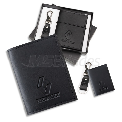 Kit exclusivo com carteira para documento de veículo e chaveiro personalizado em couro sintético na cor preta.