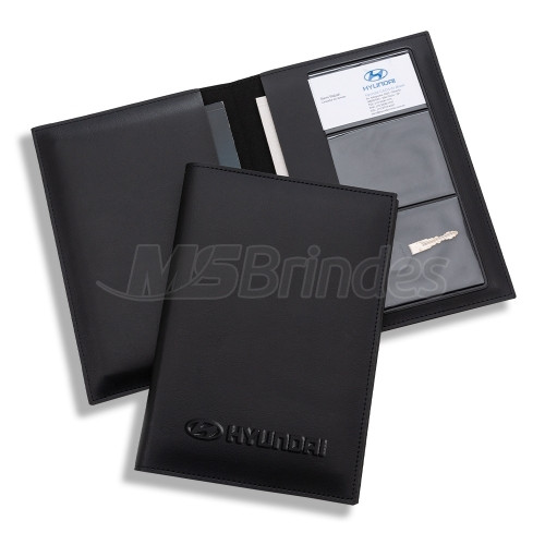 Porta manual de veículo em couro sintético, com personalização opcional em relevo. Protege e armazena manual, chave reserva e documentos do veículo.